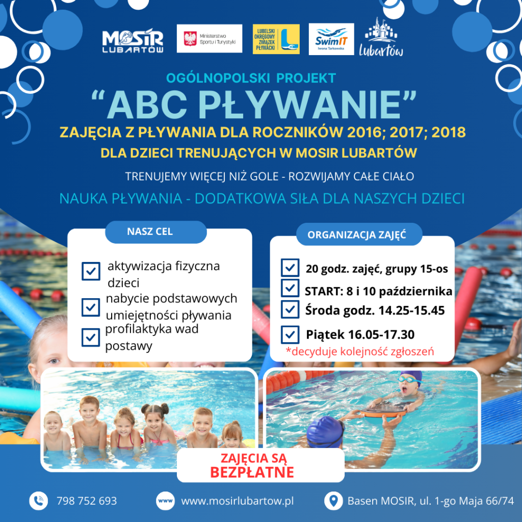 Mamy dodatkową propozycję dla Państwa dzieci z roczników 2016, 2017, 2018. W ramach ogólnopolskiego projektu, przy współpracy z SwimIT, przygotowaliśmy dla naszych zawodników bezpłatne zajęcia pływania. To doskonała okazja, aby oprócz treningów piłkarskich czy zajęć tenisa spróbować swoich sił w innej dyscyplinie sportu. Pływanie wspiera kondycję, wzmacnia całe ciało i jest świetnym uzupełnieniem każdego treningu sportowego!